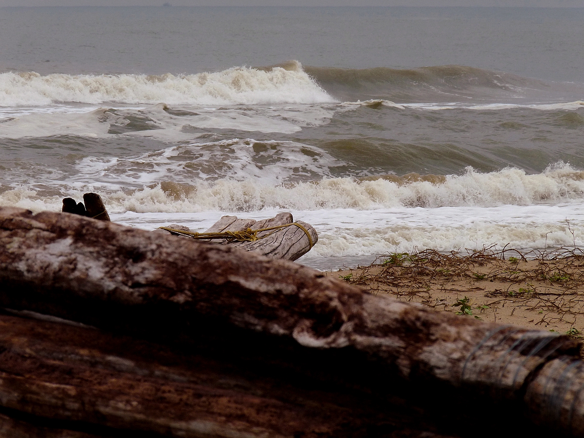 It was a chaotic stretch of beach but fairly empty but for a few fisherfolk kids playing. The weather being most inclement, fishing boats were moored like cars jammed into a parking lot on a Saturday evening. A wash of seaweed stained the shore for its entire length and the sea spat gnashing waves in contempt. Occasionally a drift of rain carried to us like a fine spray and our optics, like the sand crabs scurrying about, were ever ready to duck back into their shelter.