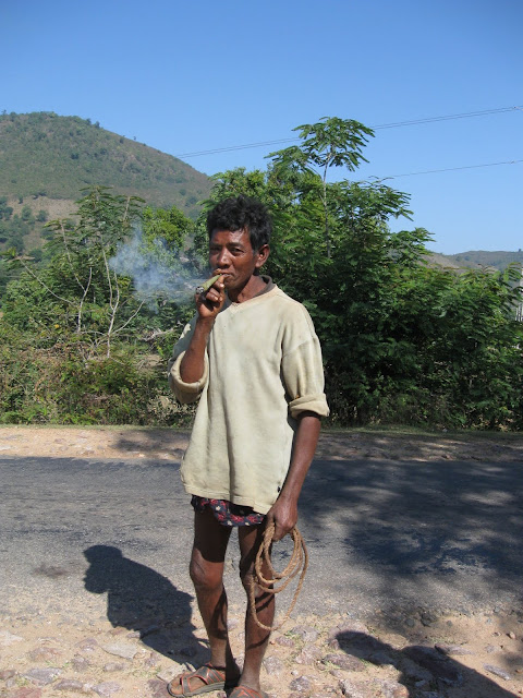 Further down the winding road we halt to greet a man smoking a huge cigar. He hails from another village but is from the same Kondha tribe. We ask permission to photograph him and he gladly poses for the camera. I’m very interested in the leaves of the cigar so, with much nodding and gesturing and a big smile to ameliorate my language shortcoming, I learn that they come from the Tendu tree – the same tree with whose leaves beedis are made.