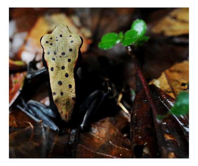 The nostrils are very close to the mouth and the tympanum, present on the black half of the body and hence not very easily seen, is as large as the eye. The size is approximately 7 cm and the snout is pointed. The backs of all the four or five frogs that we encountered bore randomly distributed black spots, providing excellent camouflage in the leaf litter. The spotting on the back may or may not be present on individual frogs though all the frogs that we encountered had them.