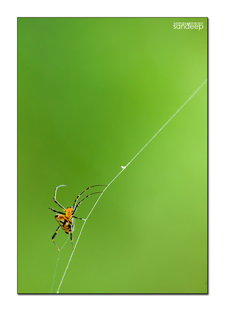 We observed Black-headed Munias (Lonchura malacca) and spotted a White-rumped Shama (Copsychus malabaricus) in a bamboo thicket. This was a male as it was jet black (the female is duller) and it had a chestnut belly and often twitched its tail like a robin. Its melodious call ends with a drop in pitch -- like a question. We observed them for some time and moved on. We spotted several spiders -- the two species we could identify were the Giant Wood Spider (Nephila maculata) and Black Wood Spider (Nephila kuhlii); there were also some species of Arigope spiders. Up in the canopy we saw Common Wood Shrikes, Velvet-Fronted Nuthatches and Bronzed Drongos.